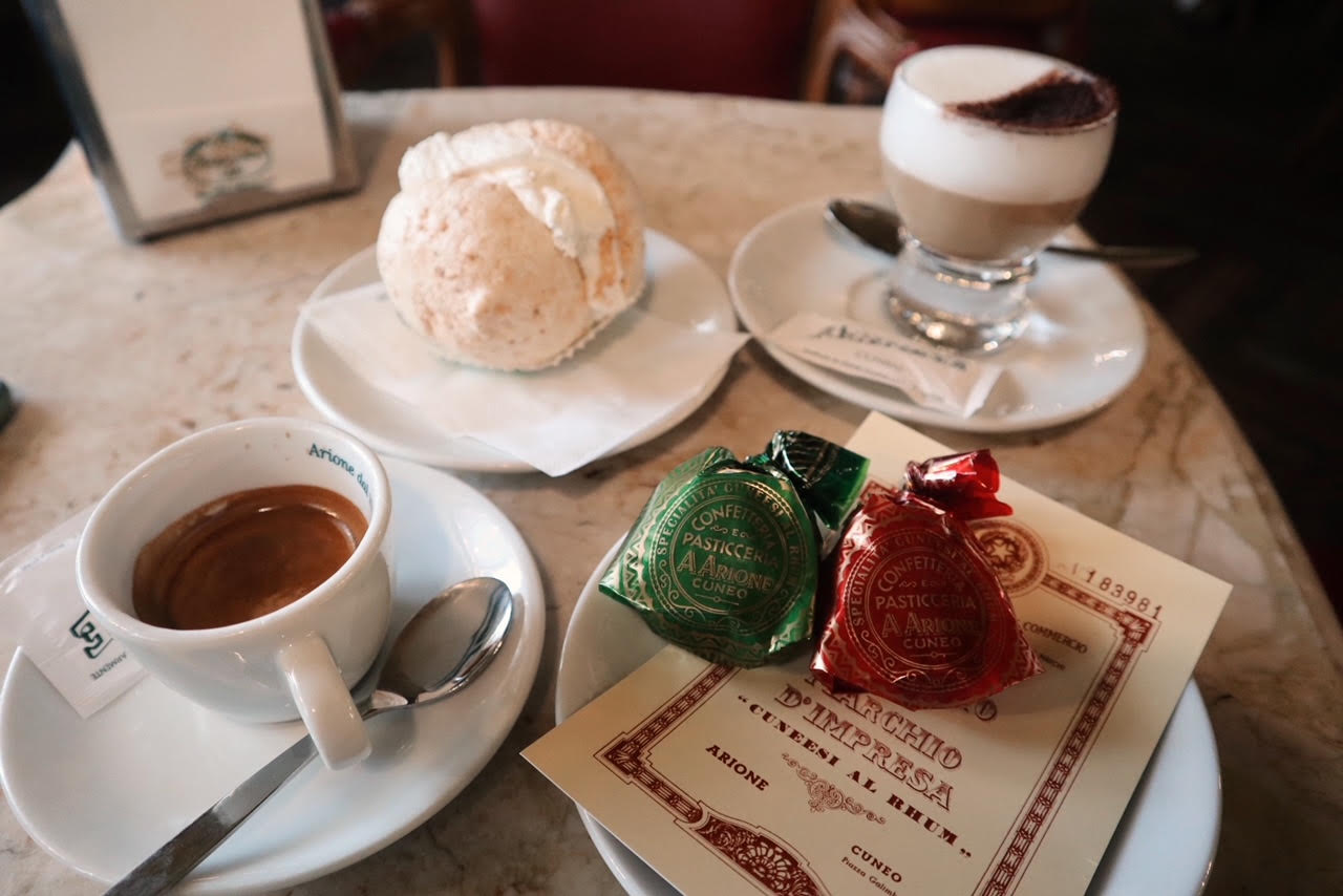 Cuneesi al Rhum. Un’impresa totalmente femminile oggi quella della famiglia Arione. Nata nel 1923 dal capostipite Andrea Arione, questa caffetteria e pasticceria si trova dagli inizi degli anni ’30 sulla Piazza Principale di Cuneo, Piazza Tancredi Galimberti. La fortuna di Arione è stata di creare i famosi Cuneesi al Rhum, gli originali. I Cuneesi al Rhum di Arione hanno ottenuto la Deco e sono gli unici a poterli chiamare così senza aggiungere il nome del marchio tra le parole Cuneesi e Rhum. Impossibile non conoscere a fondo Cuneo senza passare da Arione, anche “solo” per una meringa con la panna. Portare una scatola di leccornie di Arione in omaggio a qualcuno è come fare uno dei regali di Natale più graditi nella storia dei golosi, ve lo confermo!